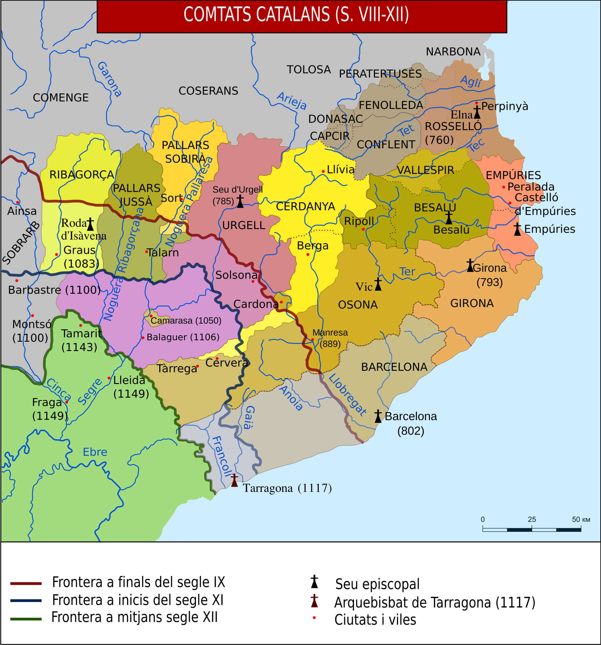 Tra le diverse contee che componevano la Marca Hispanica, alcune si distinsero per la loro posizione strategica e il dinamismo dei loro governanti. A est, affacciate sul Mediterraneo, si trovavano le contee di Barcellona, Girona, Empúries e Rosselló, con un potenziale marittimo e commerciale significativo. Più all’interno, incastonate tra le valli pirenaiche, si svilupparono le contee di Urgell, Cerdanya e Besalú, caratterizzate da un’economia prevalentemente agricola e da una maggiore autonomia dovuta alla loro posizione geografica più isolata.