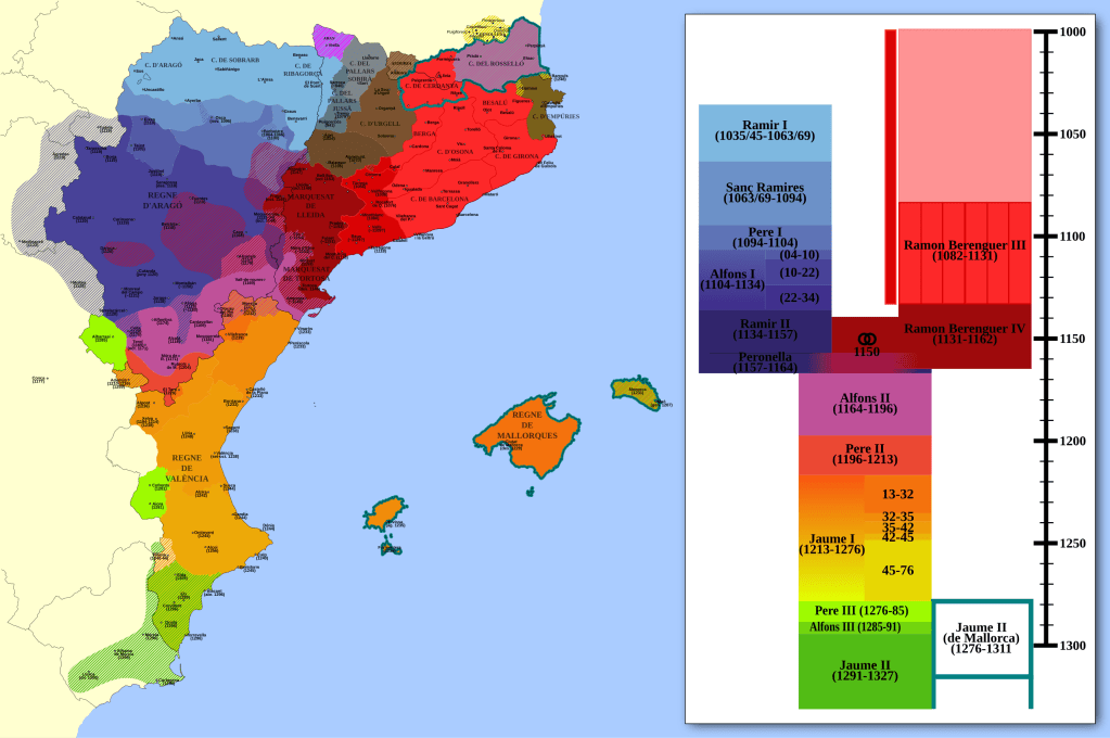 A partire dal IX secolo, le contee catalane, inizialmente vassalle dei re franchi, iniziarono un processo di crescente autonomia, culminato nella formazione della cosiddetta Corona d’Aragona nel XII secolo. Barcellona divenne un importante centro politico, economico e culturale, proiettando la sua influenza su tutto Mediterraneo.